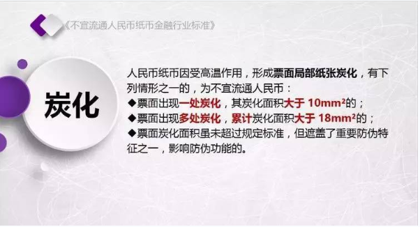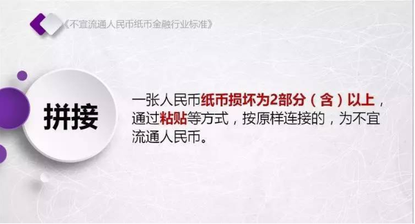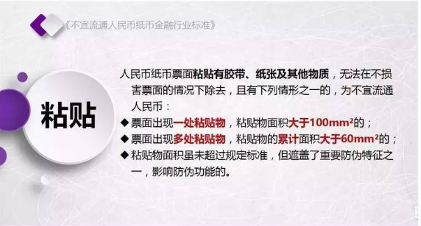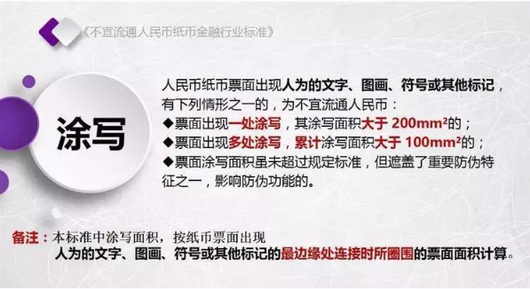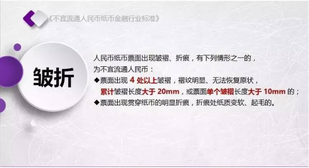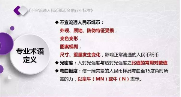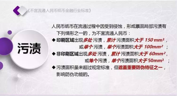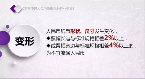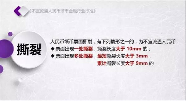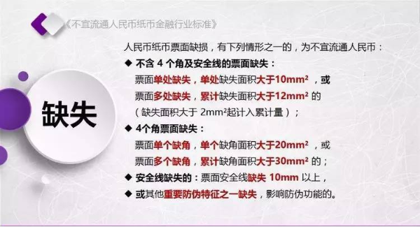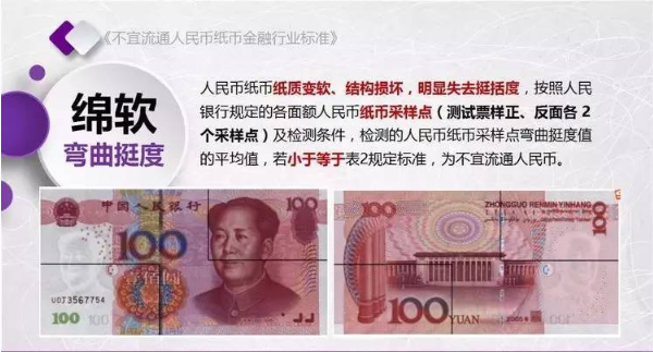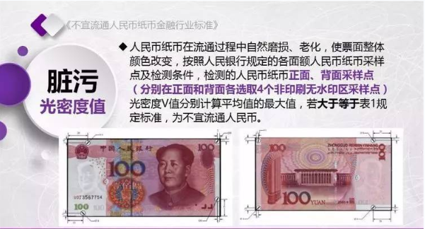 为规范不宜流通人民币纸币回收工作,人民银行发布了《不宜流通人民币 纸币》行业标准(见银发【2017】128号文,以下简称标准)。标准采用系统、量化方式,明确规定了不宜流通人民币概念,界定了各类残损人民币特征,将对提高流通中人民币整洁度管理水平发挥重要作用。