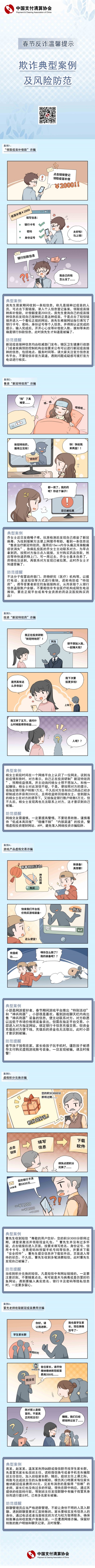 为深入学习贯彻习近平总书记关于打击治理电信网络诈骗犯罪的重要指示精神,认真落实党中央、国务院重大决策部署及人民银行有关工作要求,切实提高人民群众防范电信网络诈骗意识,助力建设更高水平的平安中国,中国支付清算协会坚持“为人民群众办实事”的宗旨,梳理国家反诈中心、会员单位、互联网络等发布的相关反诈案例素材,编写并制作春节反诈温馨提示漫画,引导普通老百姓正确认知和防范欺诈风险,牢牢守护人民群众的钱袋子安全。