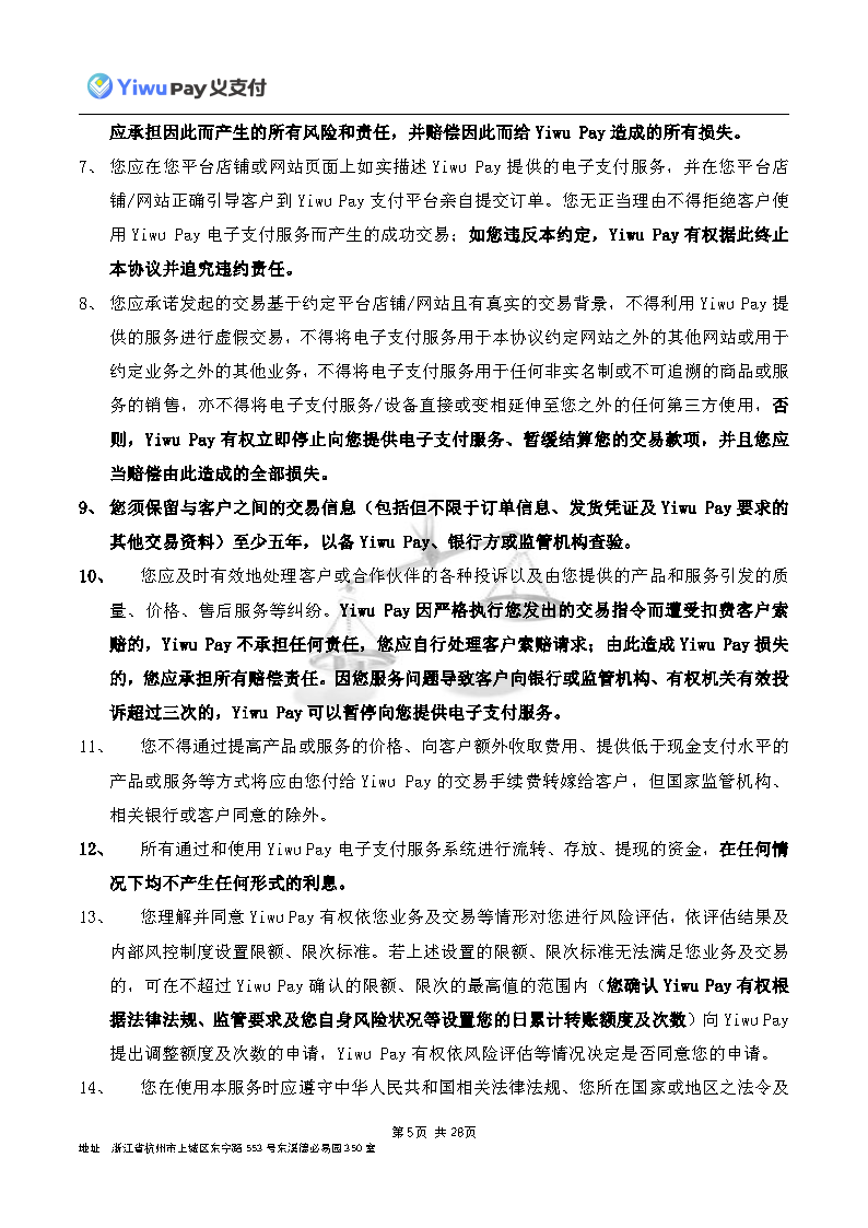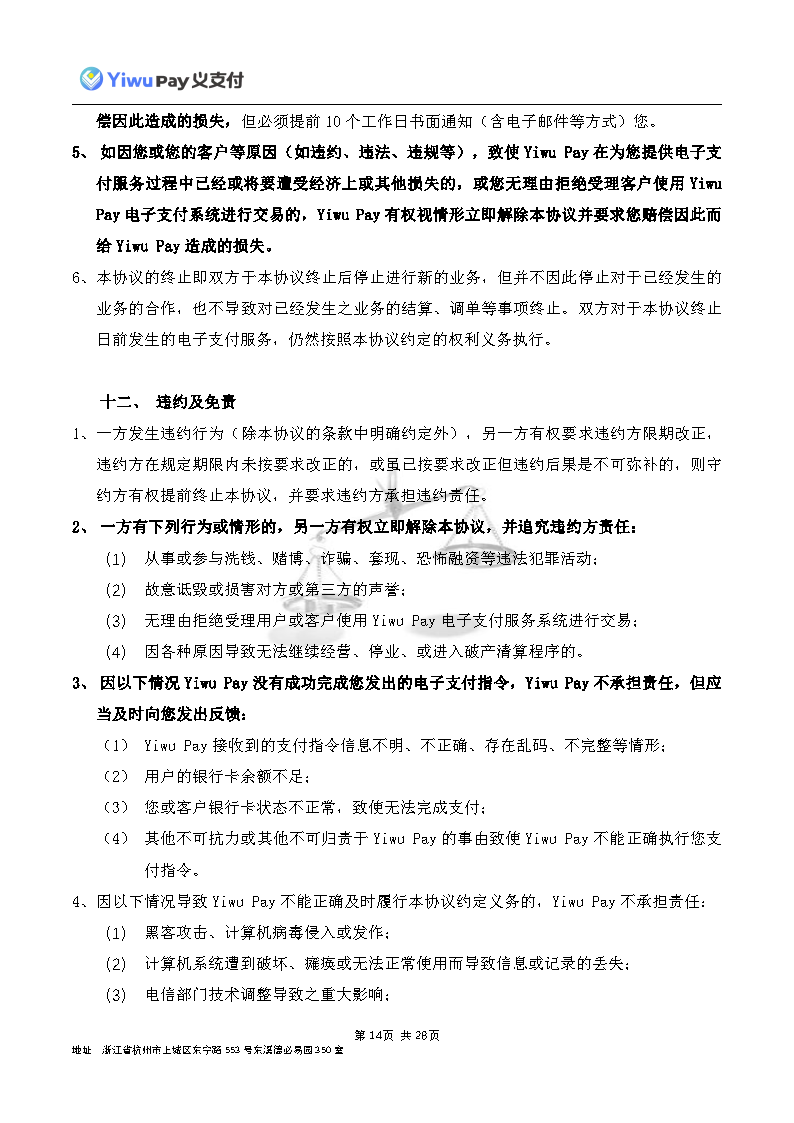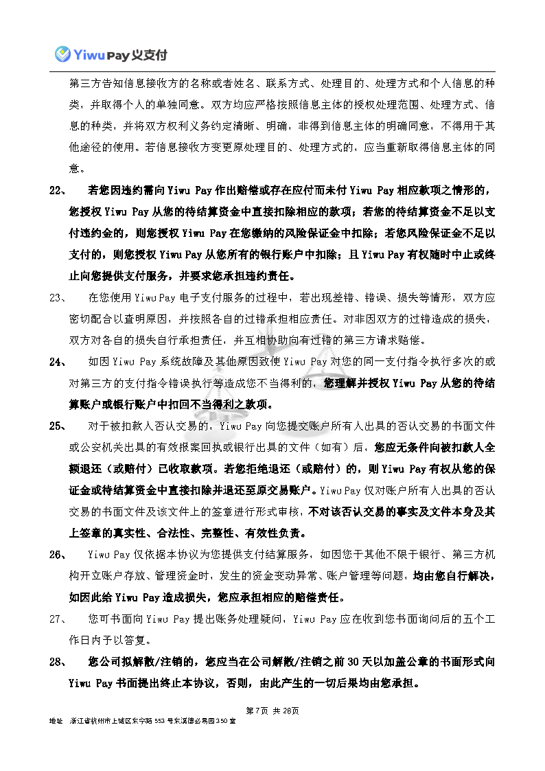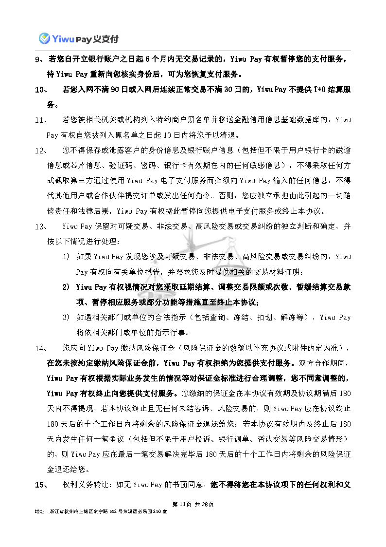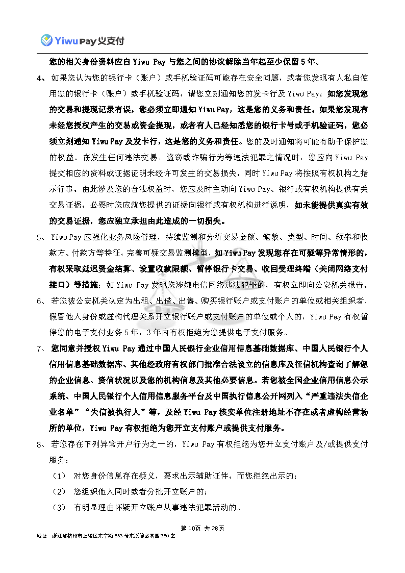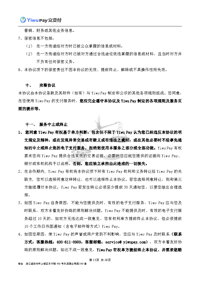 服务,切实保护您的合法权益,现依相关法规之要求,对本公司的《Yiwu Pay商户支付服务协议》内容进行变更。新协议将于公告之日起30日后生效,