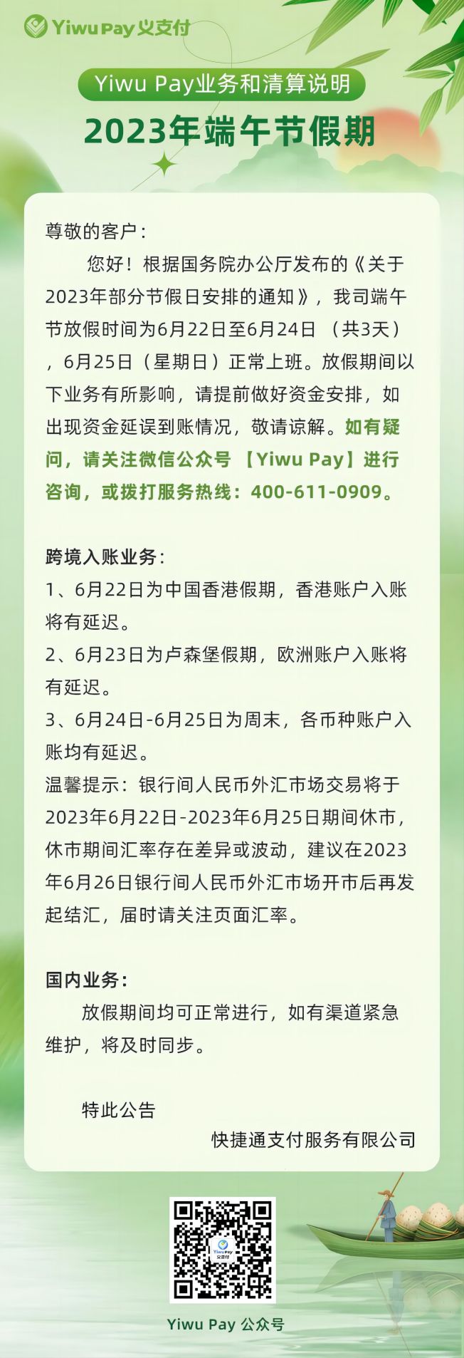 2023年端午节假期Yiwu Pay业务和清算说明