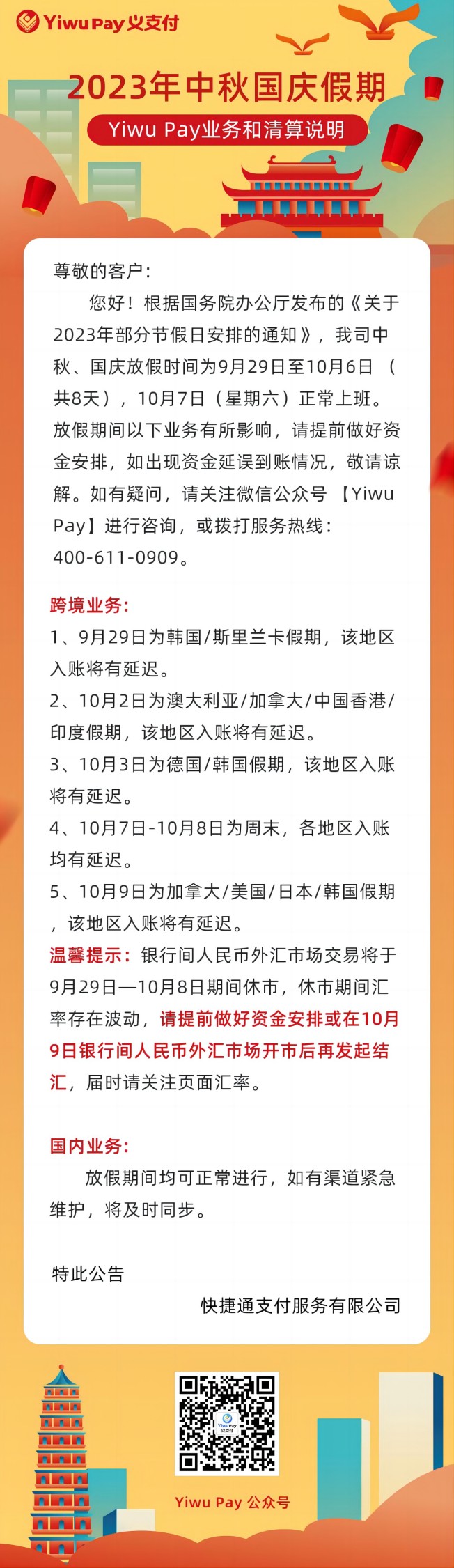2023年中秋、国庆假期YiwuPay业务和清算说明