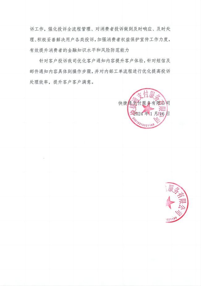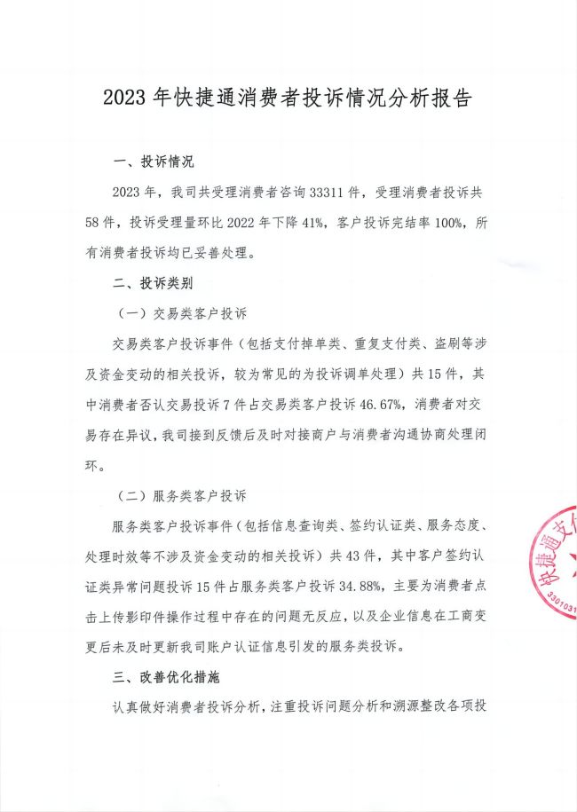 2023年快捷通消费者投诉情况分析报告 2024年01月19日
