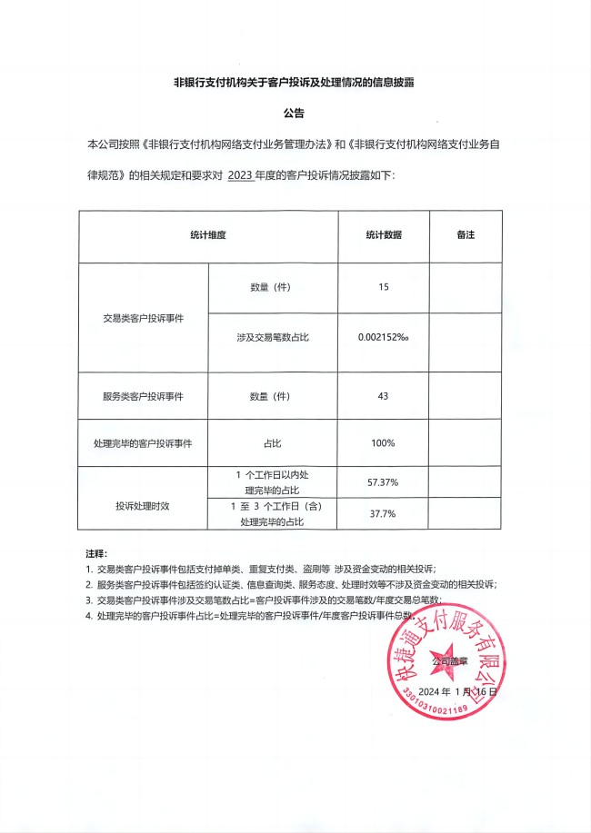 非银行支付机构关于客户投诉及处理情况的信息披露公告(2023年)