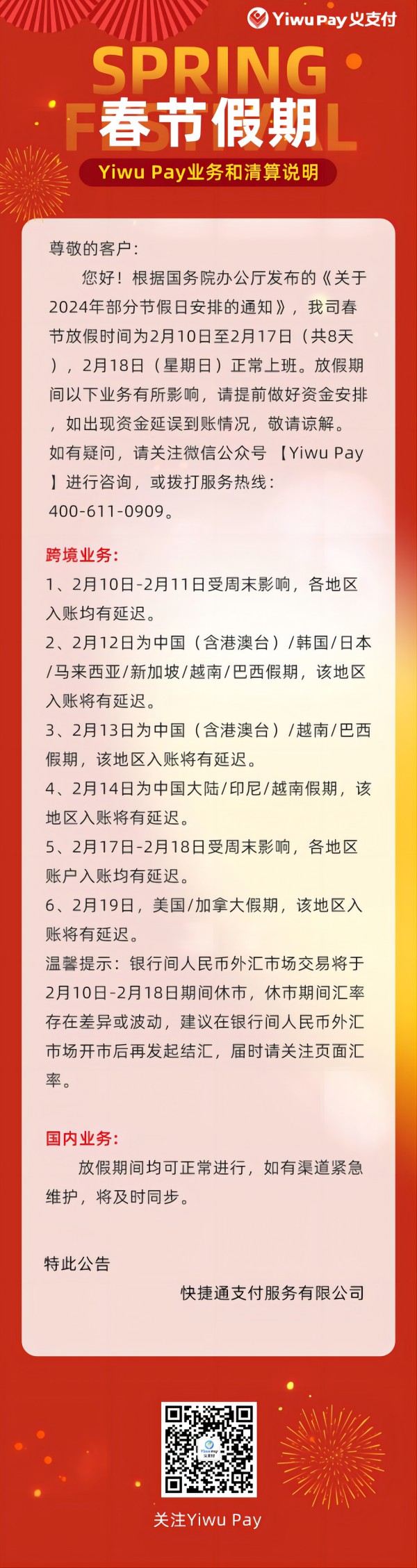 2024年春节假期YiwuPay业务和清算说明 2024年01月30日