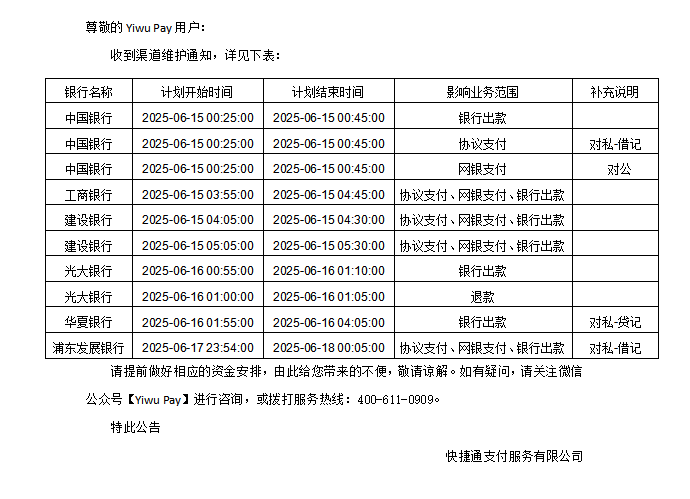 Yiwu Pay渠道维护通知