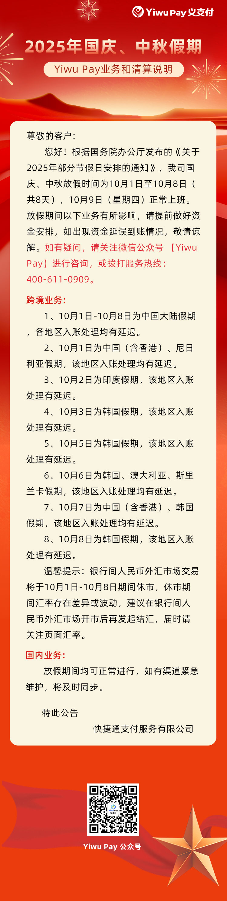 2025年国庆中秋假期Yiwu Pay业务和清算说明